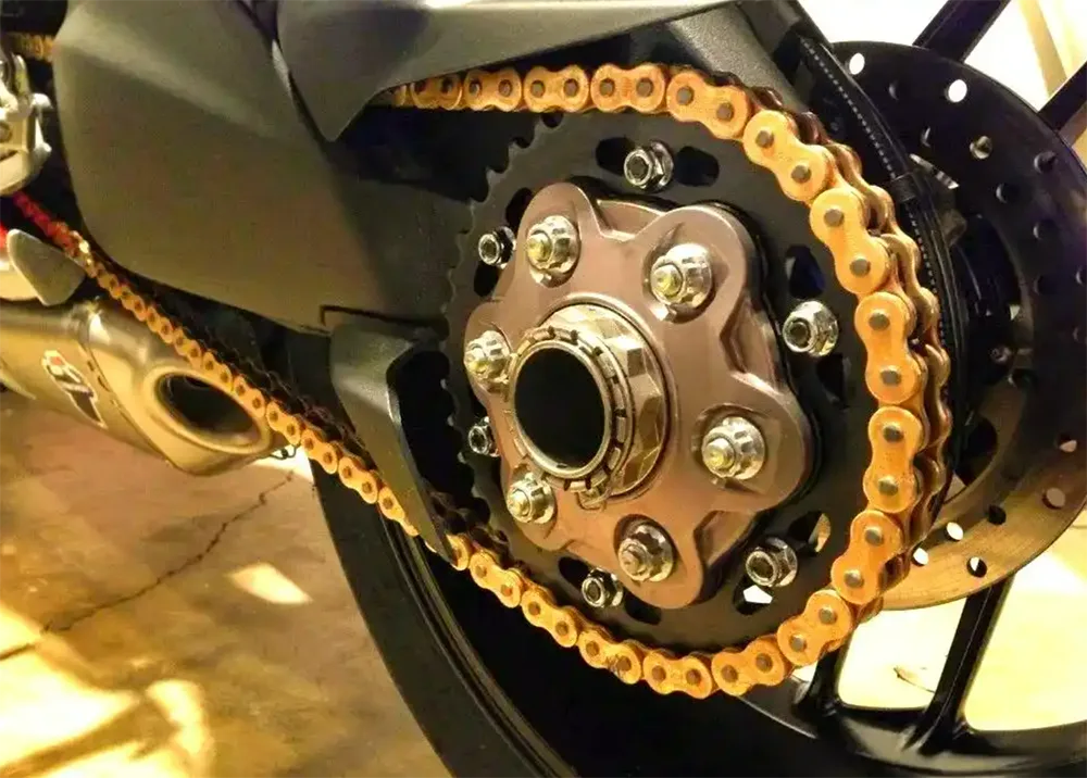 कई मोटरसाइकिलों की पावर ट्रांसमिशन योजनाओं में, चेन और स्प्रोकेट ट्रांसमिशन सिस्टम सरल और कुशल विशेषताओं के कारण कई मोटरसाइकिलों के लिए पसंदीदा विकल्प बन गया है। इसमें उच्च संचरण क्षमता और कुल मिलाकर हल्का वजन है, विशेष रूप से उन वाहन प्रकारों के लिए उपयुक्त है जिन्हें उच्च टॉर्क की आवश्यकता होती है। हालाँकि, इसकी कुछ सीमाएँ भी हैं, जैसे ऑपरेशन के दौरान घिसाव और शोर। इंजन की शक्ति को पिछले पहियों तक संचारित करने की प्रक्रिया के दौरान, आगे और पीछे के गियर के टूथ अनुपात को समायोजित करके टॉर्क प्रवर्धन और कमी अनुपात समायोजन प्राप्त किया जा सकता है।